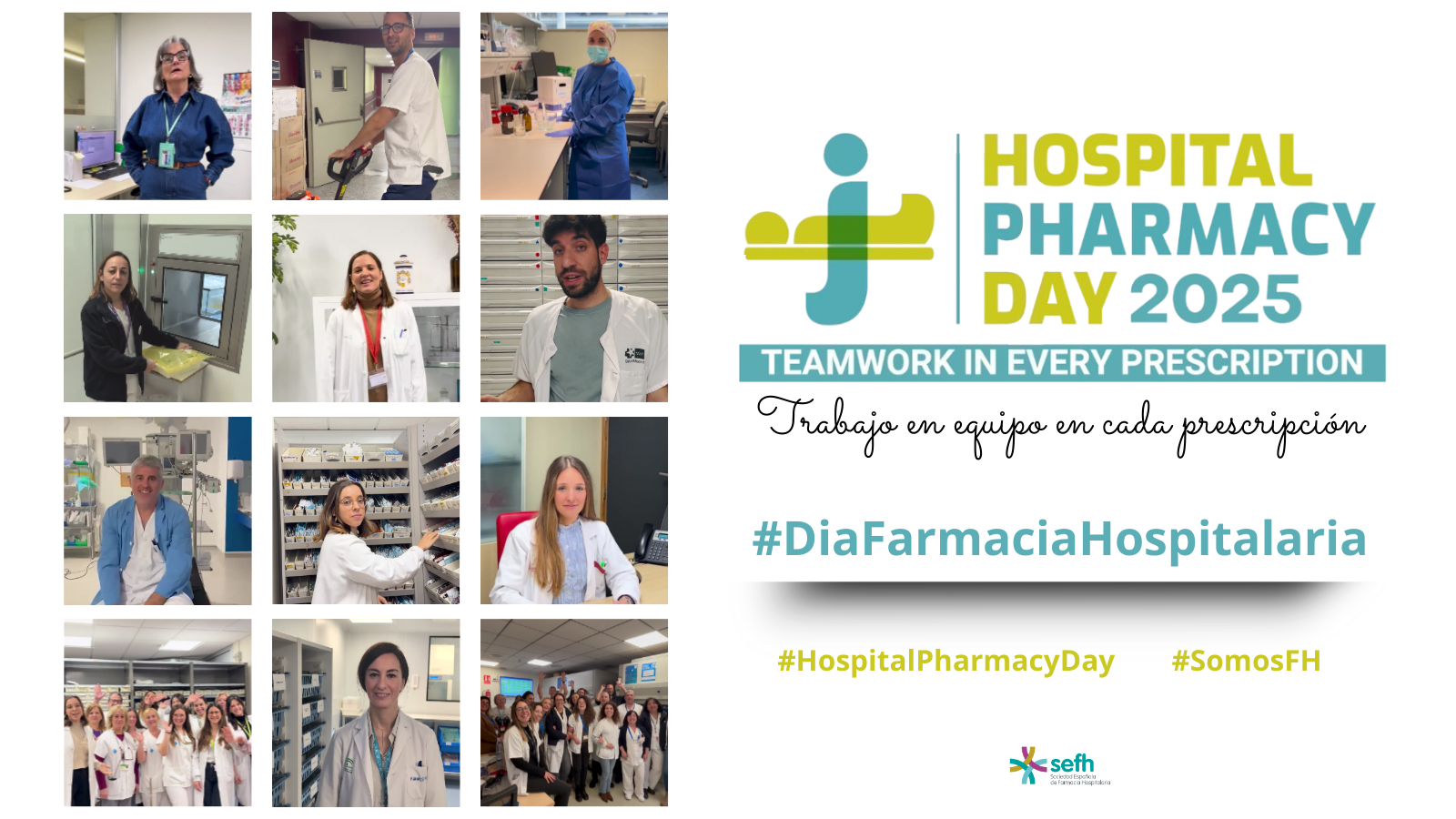 La SEFH, ha lanzado un vídeo y varios hashtag (#HospitalPharmacyDay #DiaFarmaciaHospitalaria #SomosFH) en redes sociales con testimonios de perfiles profesionales que trabajan coordinadamente en los servicios de farmacia españoles.